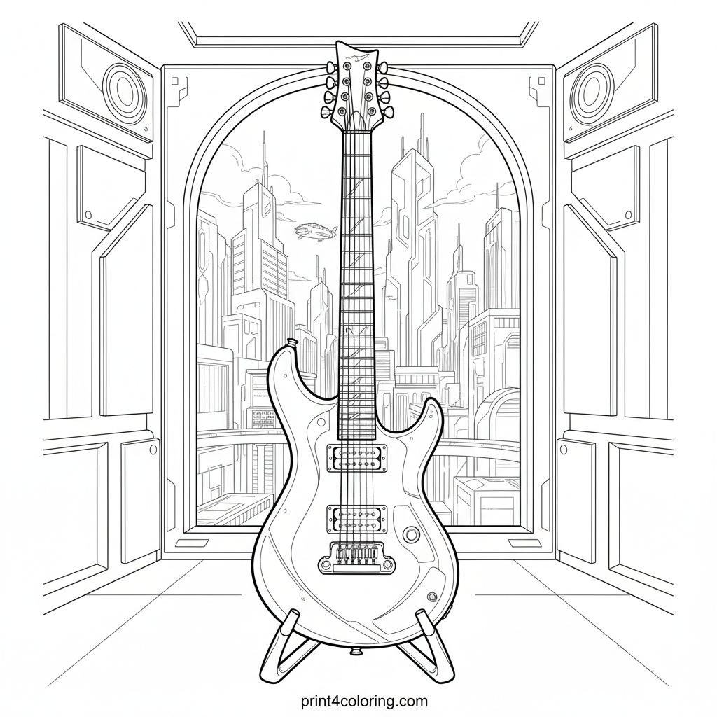 #music#futuristic#studio#guitar#cityscape#technology#architecture#coloring-page#printable
