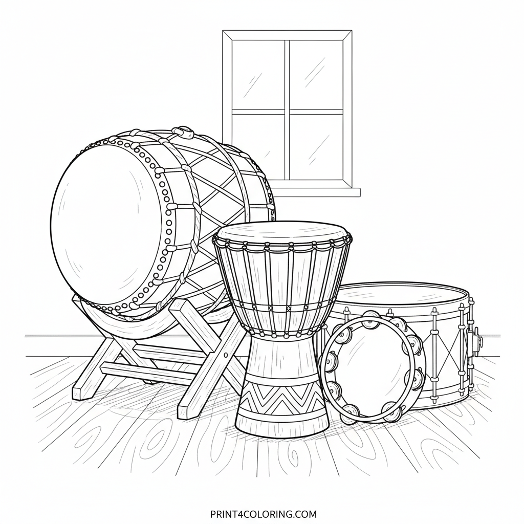 Explore the vibrant world of rhythm with this detailed coloring page featuring an artistic arrangement of drums from across the globe. Discover the intricate textures of a djembe, the smooth surface of a taiko, a classic snare drum, and a decorative tambourine, all waiting for your creative colors to bring their musical spirit to life.