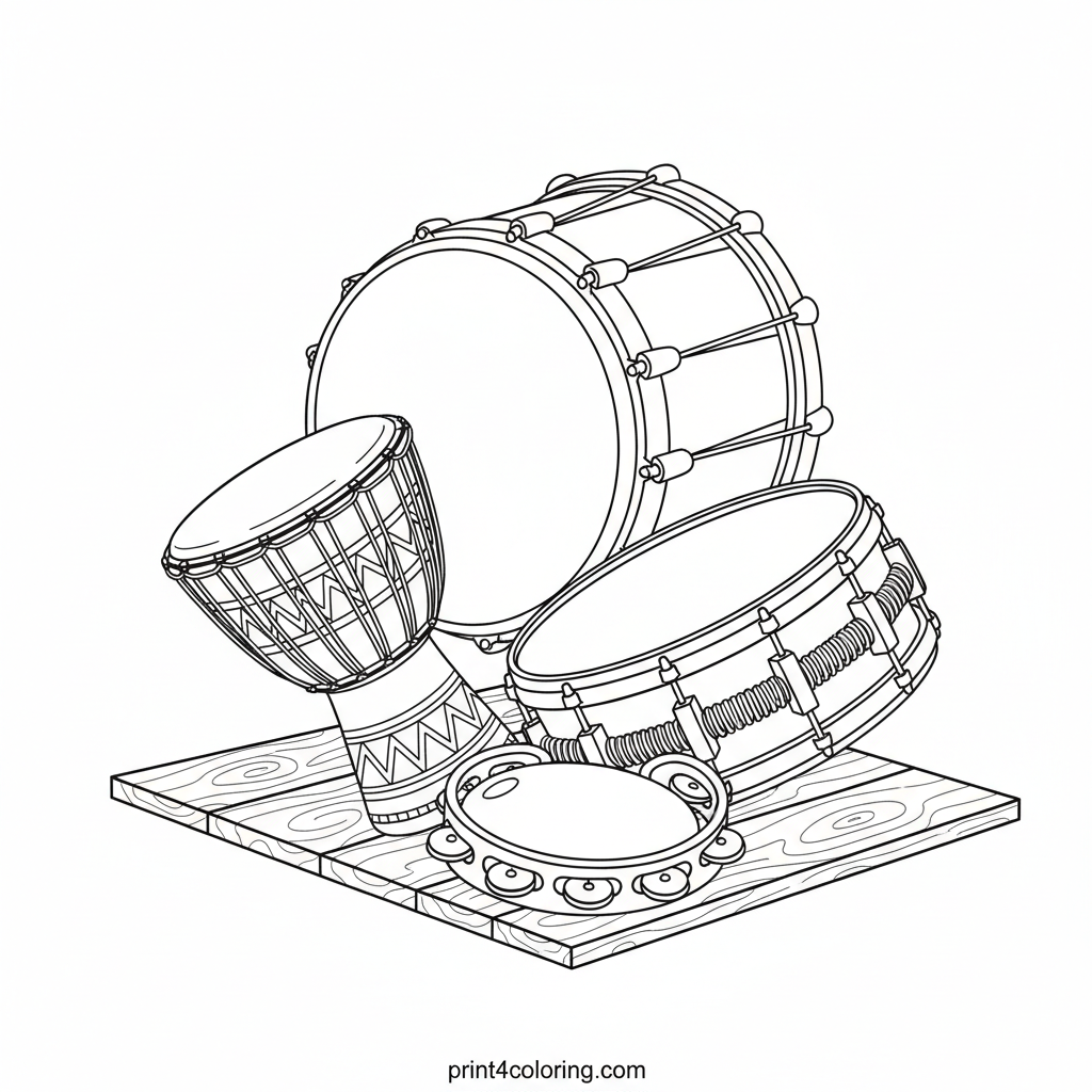 #drums#world music#instruments#cultural#detailed#still life#music#djembe#taiko#snare drum#tambourine#coloring-page#printable
