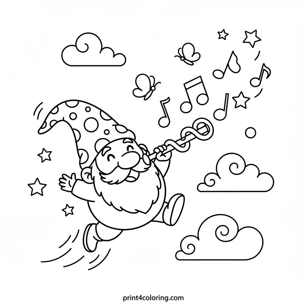 Join a cheerful gnome with a pointy hat, playing his long, swirly flute! Watch as big, round musical notes float out, magically transforming into adorable little butterflies and sparkling stars. This enchanting scene invites you to add vibrant colors to the gnome, his instrument, and the whimsical musical creatures filling the air. What magical colors will you choose?