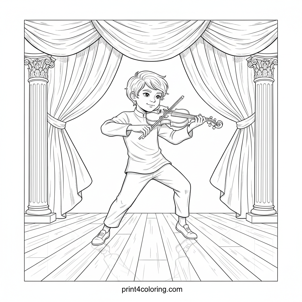 Step onto the magnificent stage of a grand concert hall! This intricate page features a talented young violinist, full of confidence and joy, playing their heart out. Lush velvet curtains, stately pillars, and a shimmering wooden floor create a stunning backdrop for your artistic flair. Bring this musical moment to life with your favorite colors!