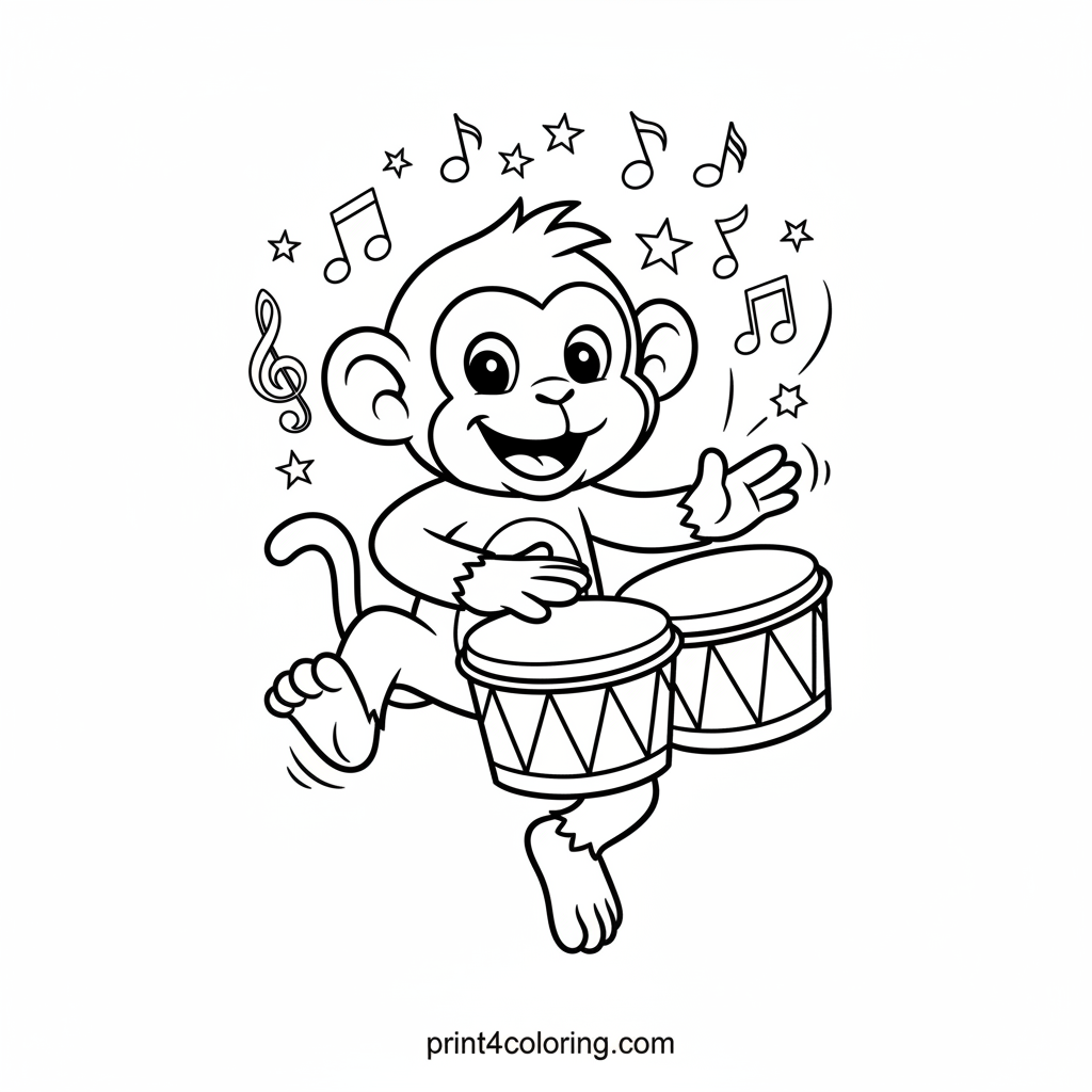 Get ready to tap your feet with this adorable, smiling monkey! Our cute primate pal sits cross-legged, happily creating a joyful rhythm on his bongo drums. Watch as little musical notes float playfully into the air, inviting you to add vibrant colors to this lively scene. It's a musical adventure waiting for your artistic touch!