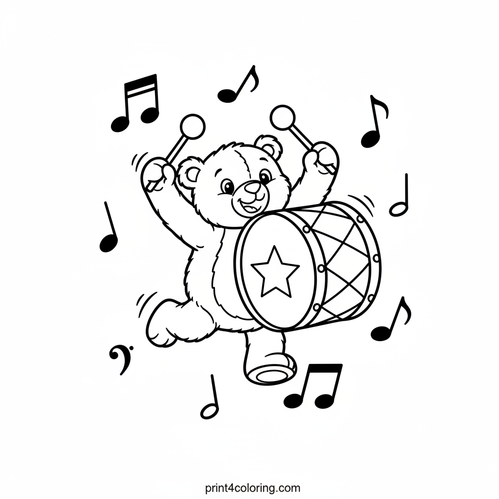 Join our super happy, fluffy teddy bear as he creates a joyful rhythm! With big, friendly eyes, he's expertly tapping a large bass drum with a soft mallet. Simple musical notes dance around him, inviting you to add vibrant colors to this delightful, musical scene. Get ready for some drumming fun!