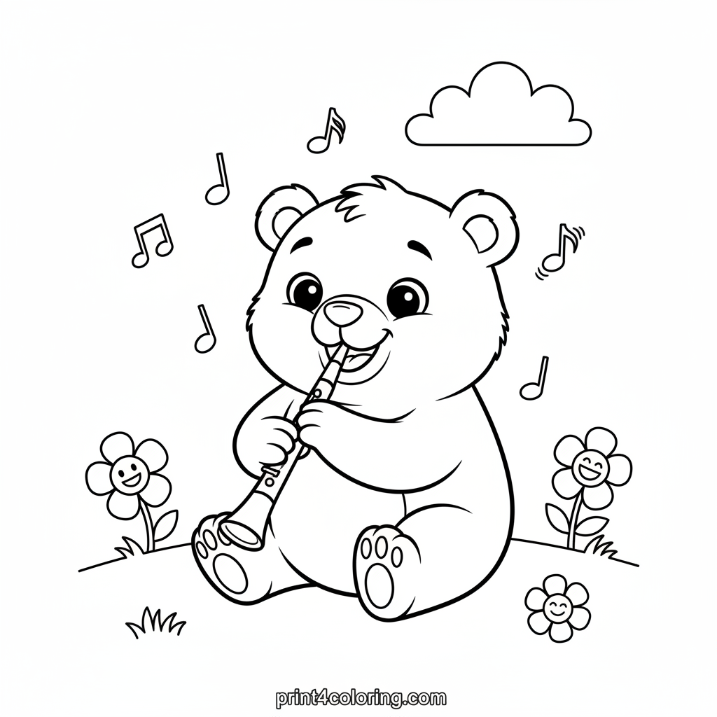 This happy bear cub is ready for its big musical debut! With a sweet smile and big, friendly eyes, it plays a cheerful tune on its clarinet. Musical notes float playfully around its head, inviting you to color this adorable, melodic scene and imagine the joyful sounds.