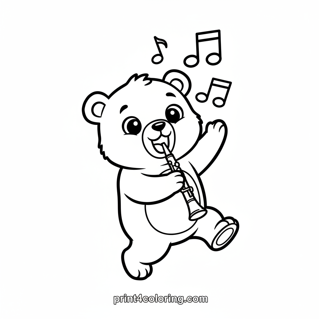 Join our adorable, round-faced bear cub as he shares a joyful tune on his clarinet! With big, friendly eyes and a happy expression, this sweet musician fills the air with cheerful melodies. Musical notes playfully float around his head, inviting you to add vibrant colors to his heartwarming performance. A delightful scene for young artists!