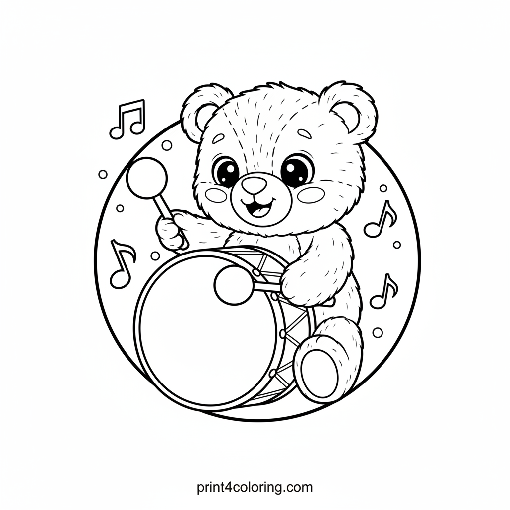 Join our adorable, fluffy teddy bear as he creates a happy rhythm! With big, friendly eyes, this cuddly musician joyfully taps a large bass drum. Playful musical notes dance in the air, inviting you to add vibrant colors to his cheerful performance. A cozy scene perfect for little artists to enjoy.