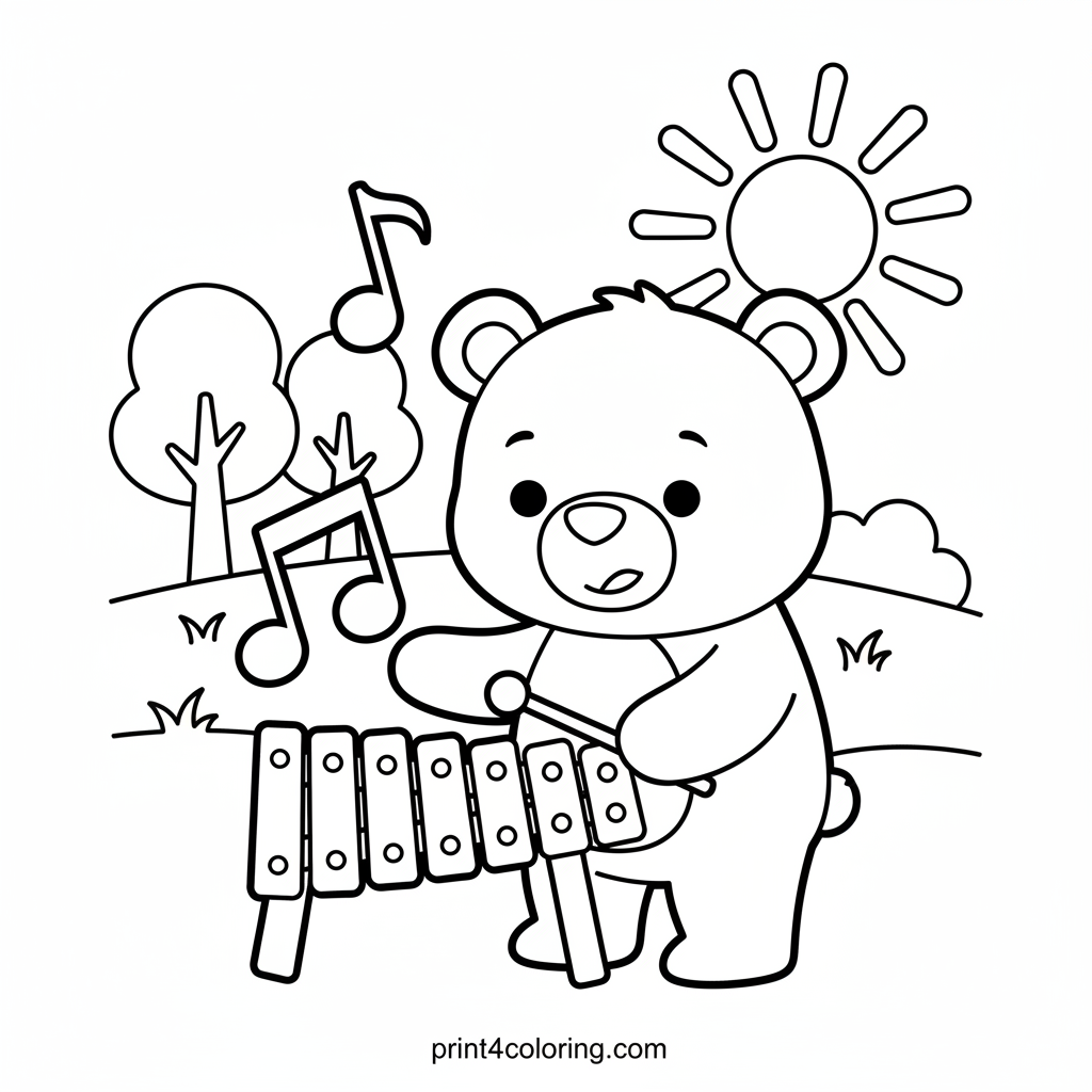 Join our happy bear as he creates beautiful music! With a cheerful smile, this friendly bear gently taps a colorful xylophone, making musical notes dance in the air. Grab your crayons and bring this delightful scene to life with vibrant colors and joyful sounds. A perfect page for little artists!