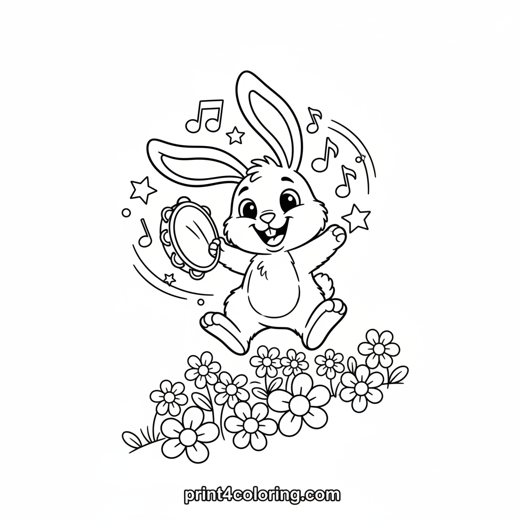 Meet a cheerful little bunny with big, sparkling eyes, ready to make some music! This fluffy friend is happily shaking a tambourine, surrounded by floating musical notes and pretty flowers in a sunny meadow. Grab your crayons and bring this joyful, rhythmic scene to life with your favorite colors!