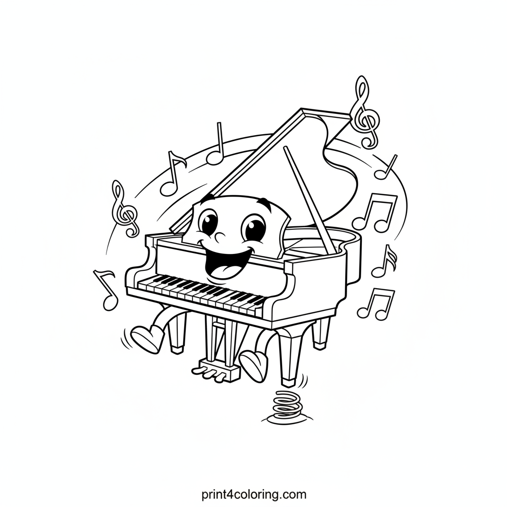 Get ready to color a super happy grand piano that's practically dancing with joy! This friendly instrument has big, smiling eyes and a wide grin, surrounded by a swirl of tiny, cheerful musical notes. Bring this musical scene to life with your favorite colors and imagine the beautiful melody it's playing!