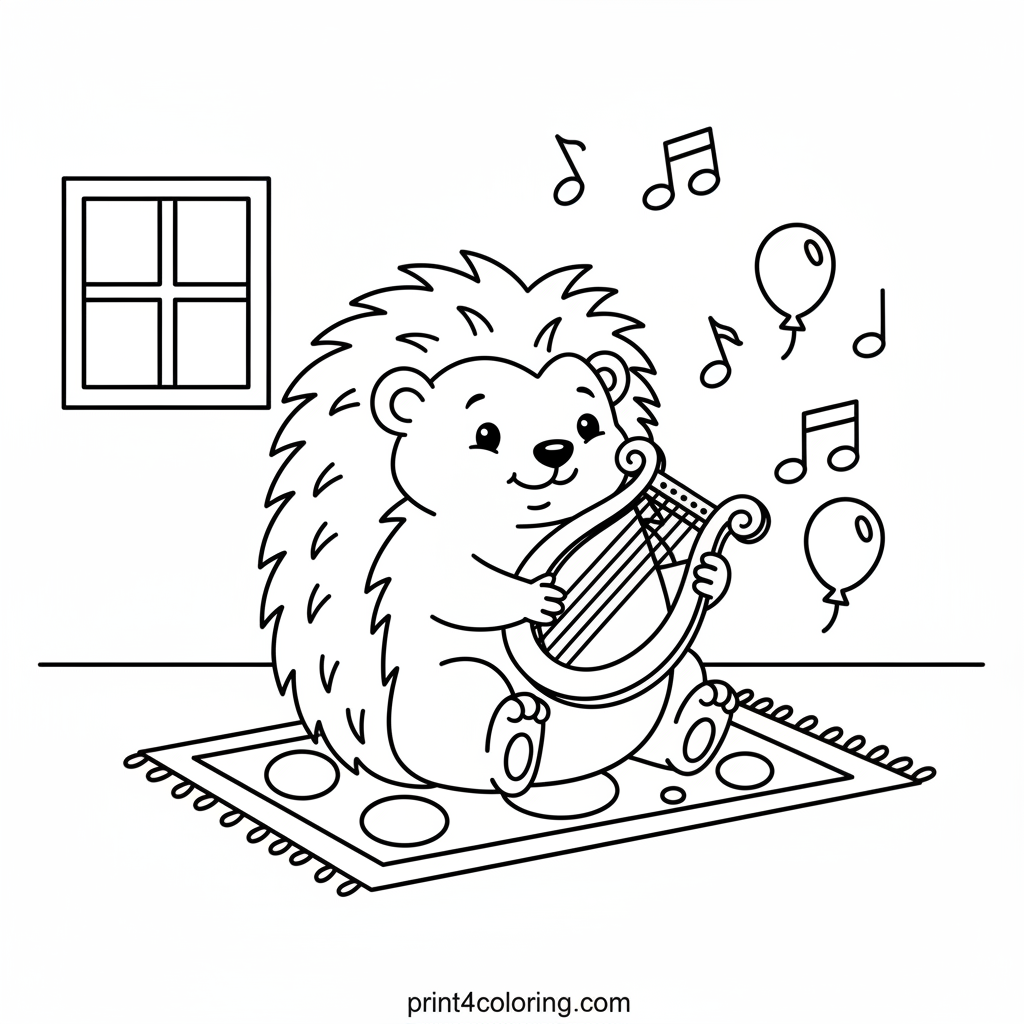 Get ready to color a heartwarming scene! Our happy hedgehog friend is smiling brightly, playing a beautiful celtic harp. Watch as musical notes float around him in his cozy room. Use your favorite colors to bring this sweet melody to life and make his quills extra soft and colorful!