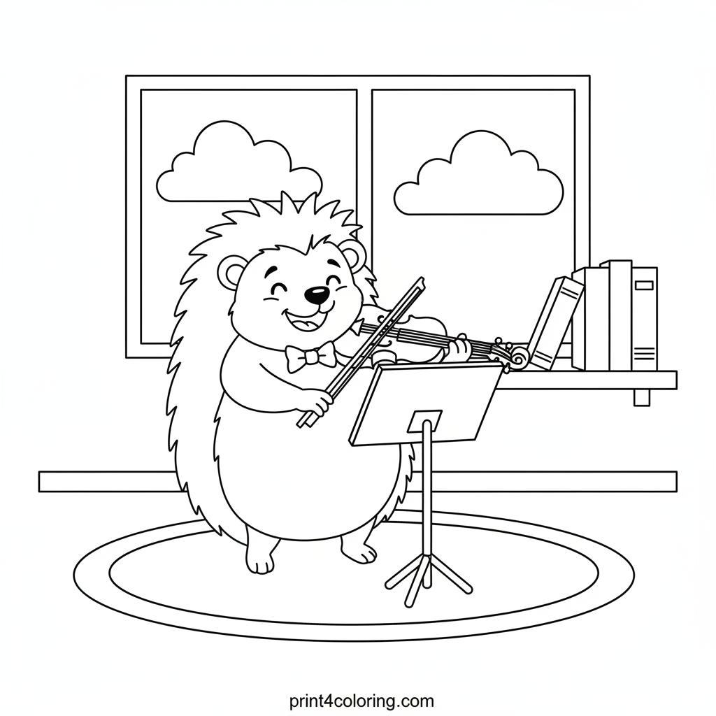 Meet a cheerful hedgehog, wearing a tiny bow tie, diligently practicing its large, friendly violin! With a simple music stand, it carefully draws the bow across the strings. This charming scene invites you to add vibrant colors to the hedgehog, its instrument, and the cozy practice space, bringing its musical dreams to life.