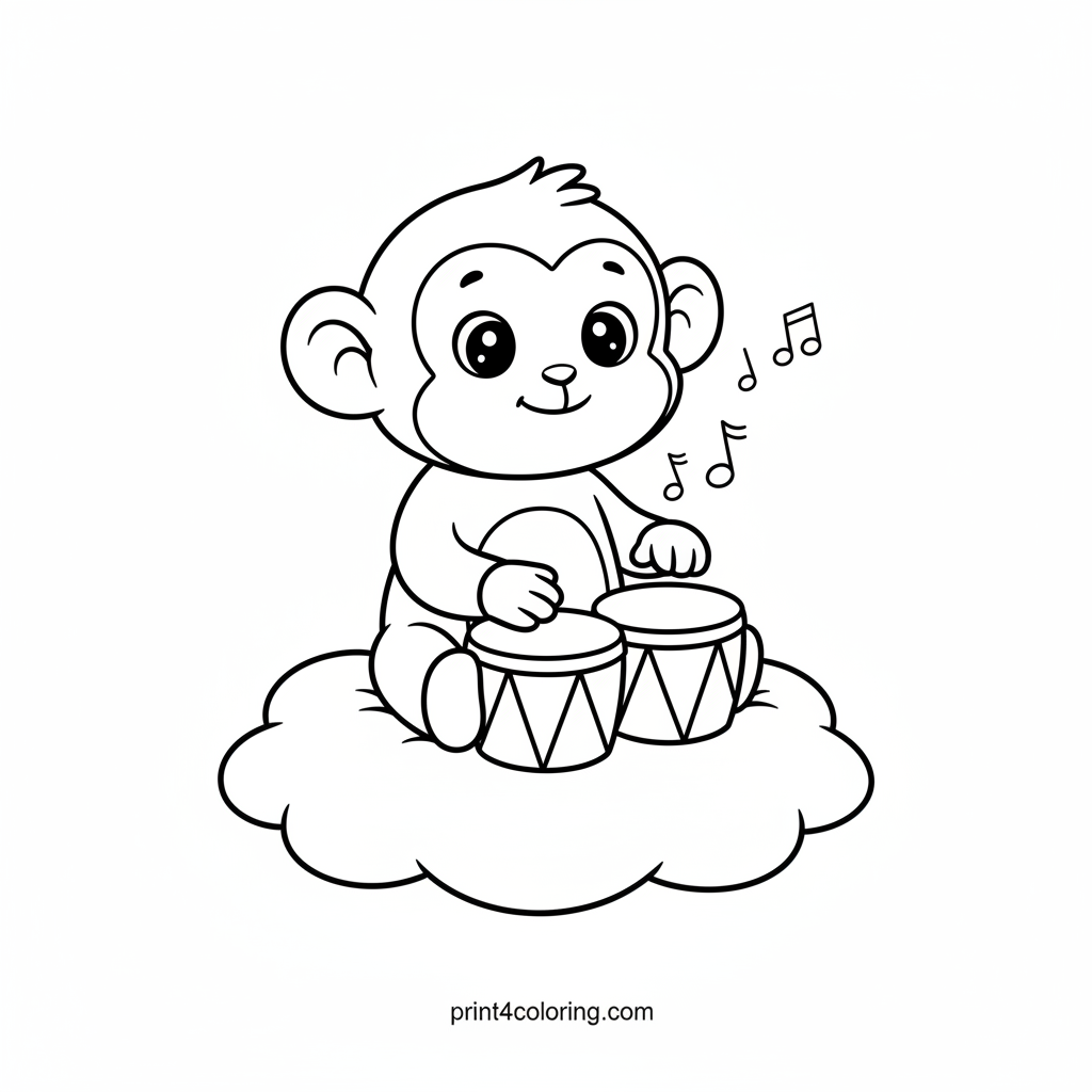 Get ready for a musical adventure! This adorable monkey is sitting cross-legged, happily tapping bongo drums with a big, friendly smile. Playful musical notes float into the air, inviting you to add vibrant colors to this cozy, rhythmic scene. Perfect for little artists!