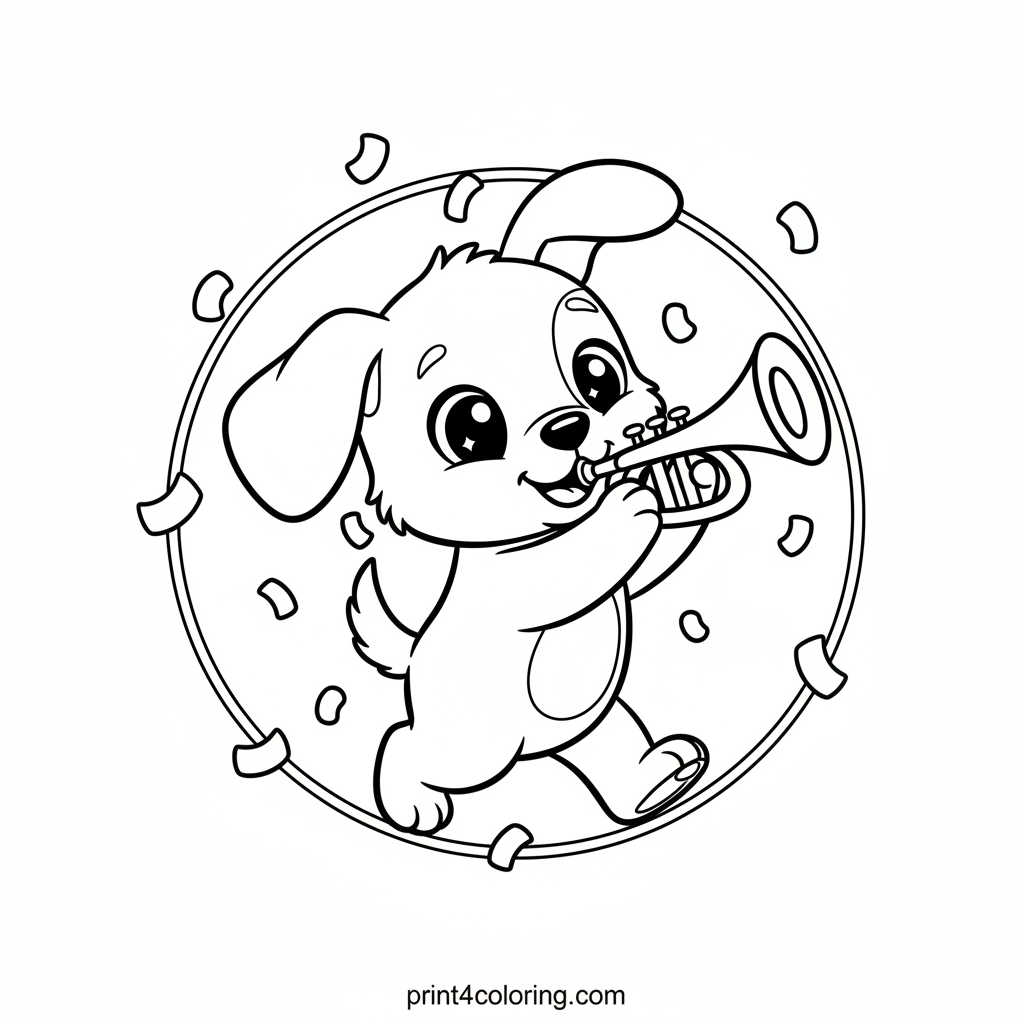 Get ready for a joyful celebration with this adorable parade puppy! With floppy ears and a wagging tail, this happy pup marches proudly, holding its shiny trumpet high. Large, rounded confetti shapes float gently around, creating a festive scene. Grab your crayons and bring this musical moment to life!