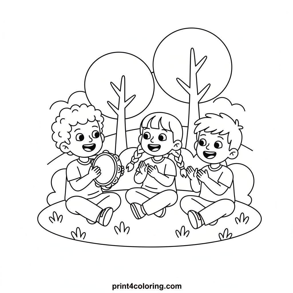 Join three happy friends for a delightful music session in the park! One child joyfully shakes a tambourine, while the others clap and sing along to the cheerful beat. With gentle trees in the background, this cozy scene celebrates friendship and music. Get ready to add vibrant colors to their happy jam!