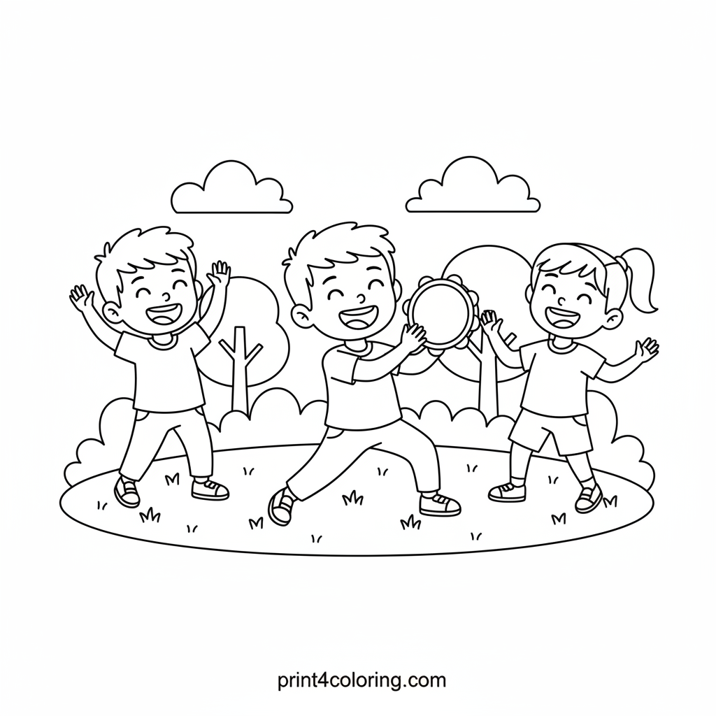 Join three happy friends for a joyful music session in the park! One child energetically shakes a tambourine, while the others clap their hands and sing along to the beat. Simple trees sway gently in the background, creating a perfect setting for this delightful outdoor jam. Get ready to add vibrant colors to their musical adventure!