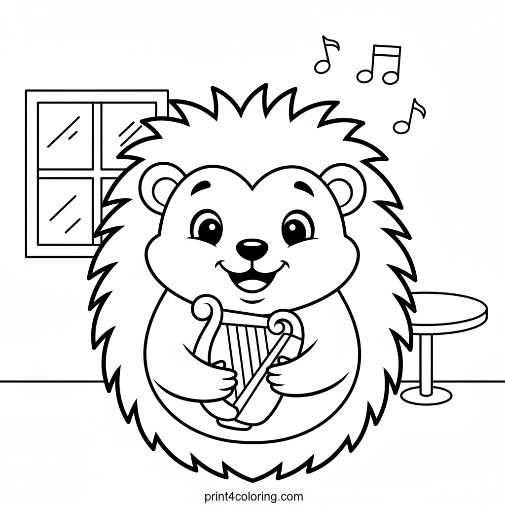 Join a cheerful hedgehog as it plays a beautiful melody on its tiny Celtic harp. Little musical notes float playfully around, filling a cozy room with sweet sounds. This adorable close-up scene invites you to add vibrant colors to its soft quills and the gentle strumming magic.