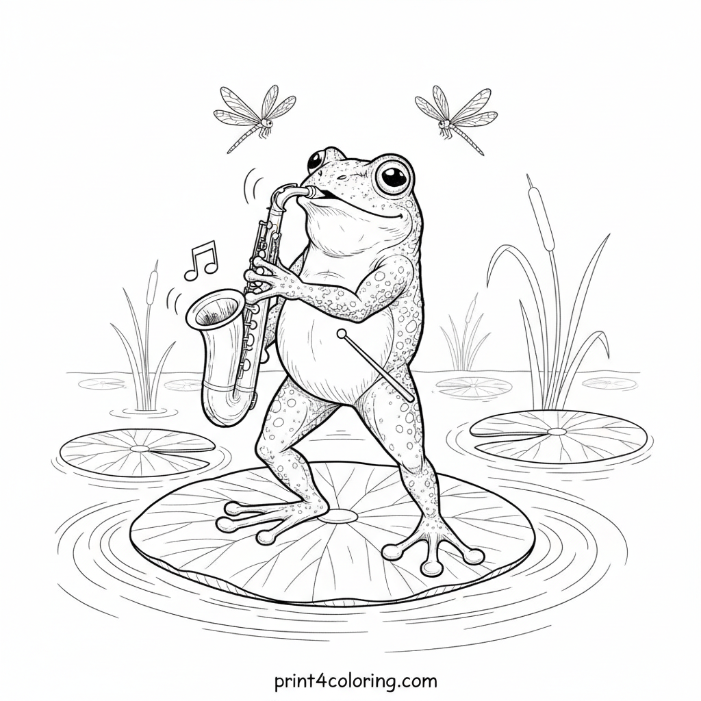 #frog#saxophone#jazz#music#lily pad#dragonflies#swamp#amphibian#musical#coloring-page#printable