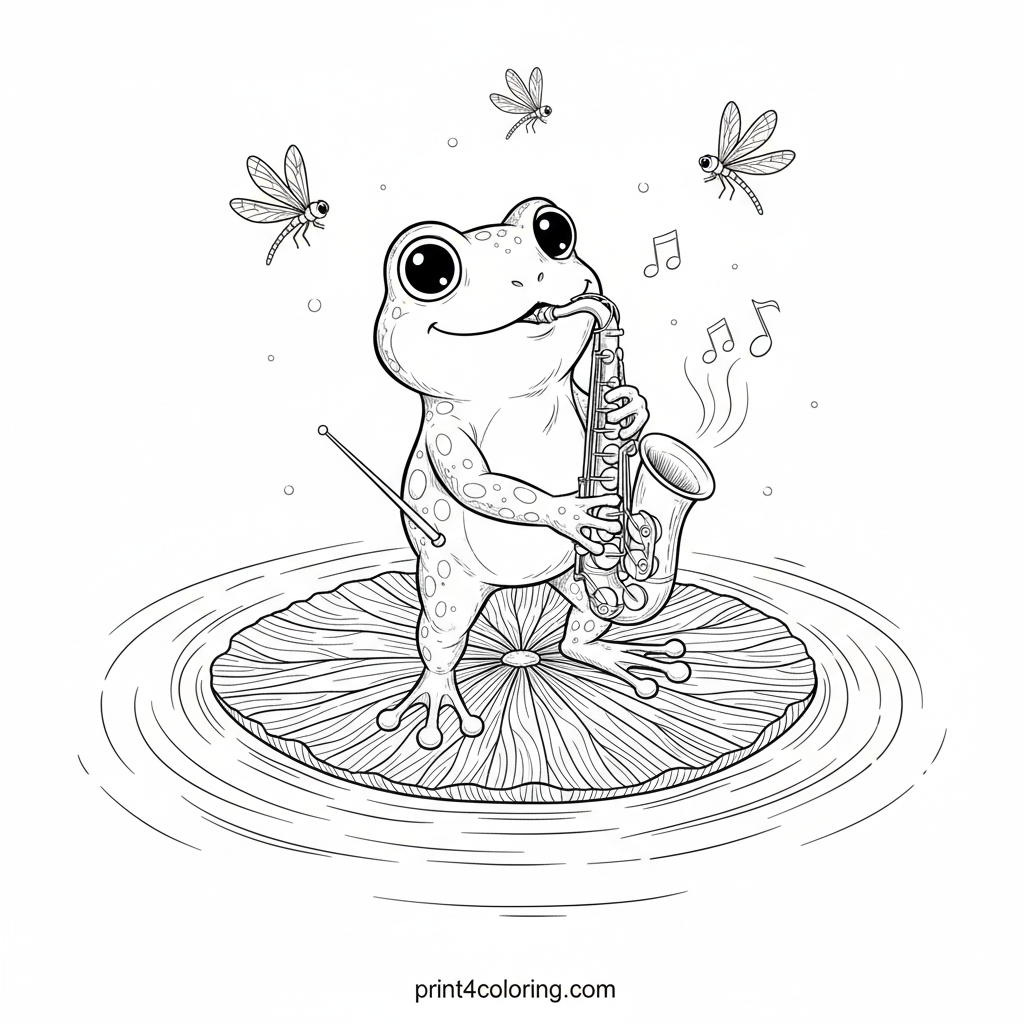Hop into a delightful scene! A cheerful frog, with a tiny conductor's baton tucked under its arm, plays a beautiful saxophone on a large lily pad. Gentle water ripples and graceful dragonflies add charm to this cozy, musical moment. Perfect for a relaxing coloring session!