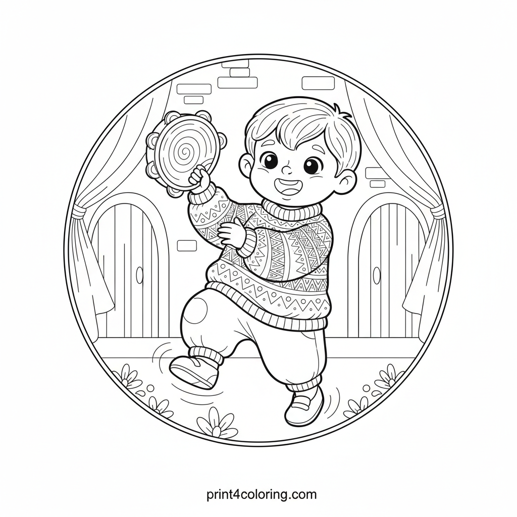 Get ready to color a lively scene! A cheerful musician, full of energy and smiles, is caught mid-dance, shaking a beautifully detailed tambourine with all their might. Imagine the music as you bring this vibrant street scene or cozy stage to life with your colors. Capture the rhythm and joy!