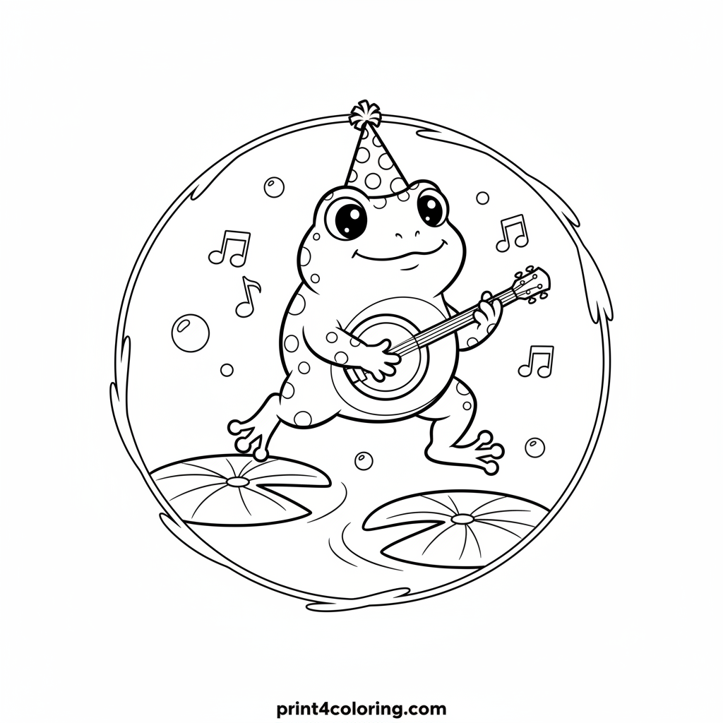 #frog#banjo#music#lily pad#cute#animal#party hat#coloring-page#printable