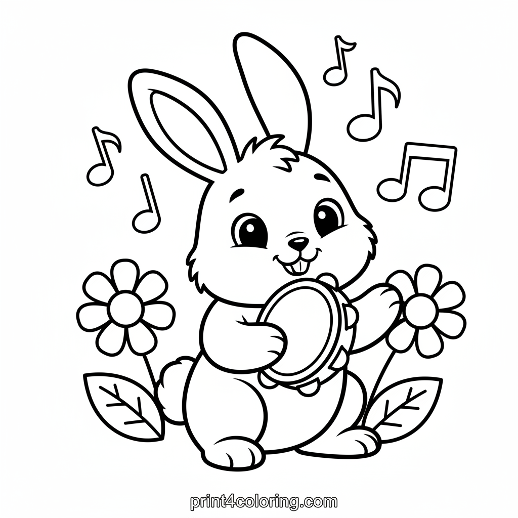 Meet a sweet, fluffy bunny with big, happy eyes, ready to make music! This adorable friend is gently shaking a tambourine, with musical notes floating around its head in a field of simple flowers. Grab your crayons and bring this joyful, rhythmic scene to life with your favorite colors!