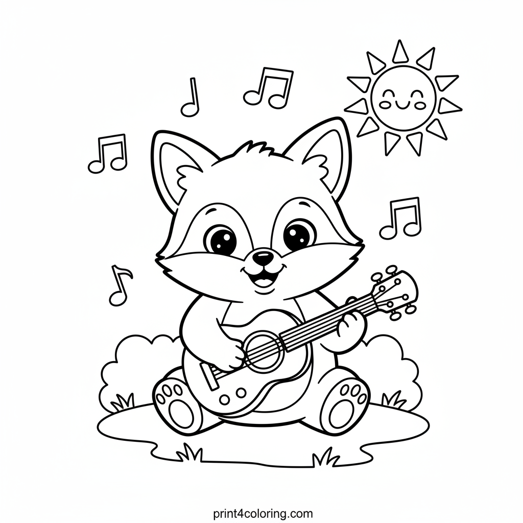 Join a super cute baby fox as it discovers the joy of music! With big, curious eyes and a happy smile, this little fox is strumming its colorful, child-sized electric guitar for the very first time. Simple music notes float around, filling the air with pretend tunes. Grab your crayons and add vibrant colors to this adorable musical adventure!