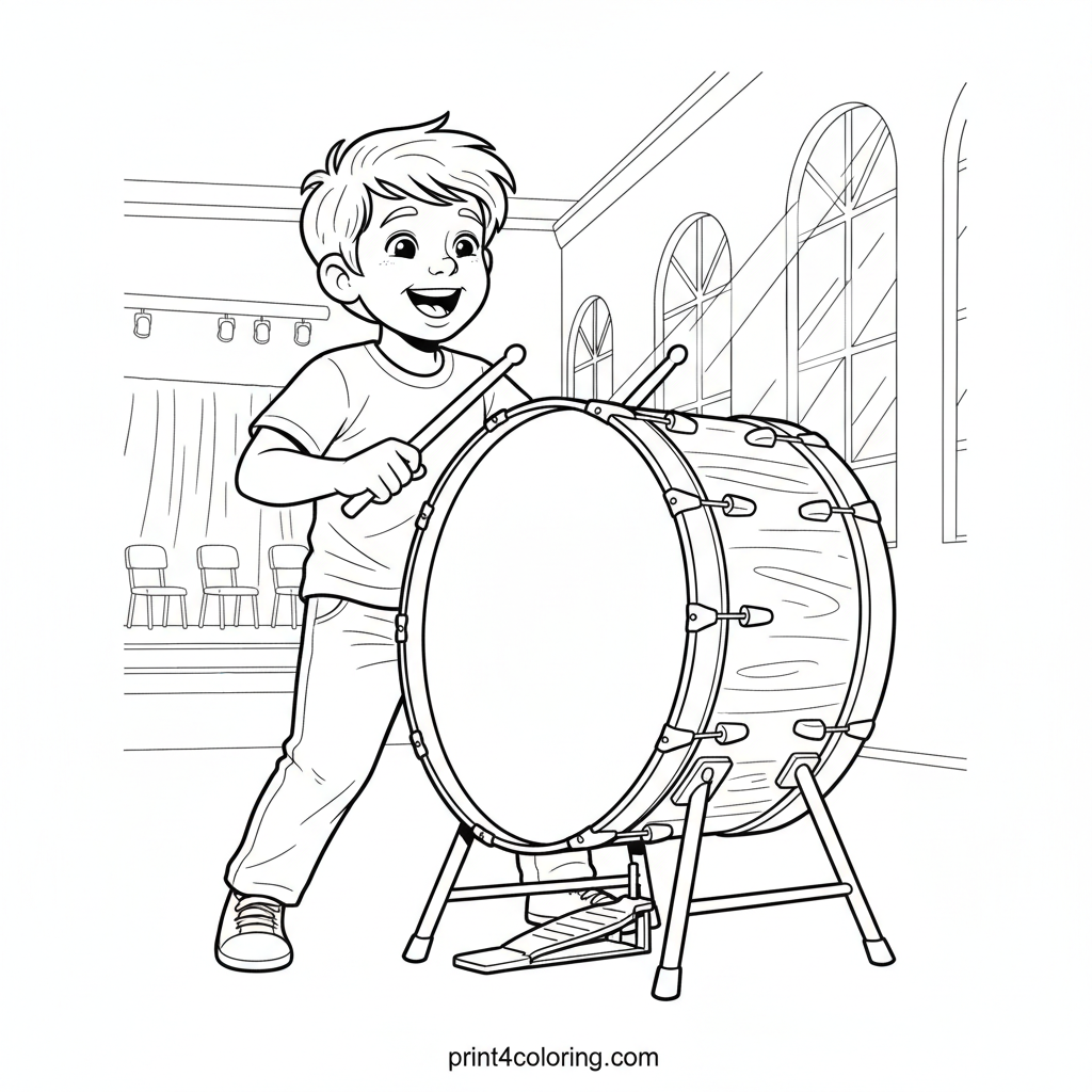Dive into the rhythm with this coloring page of a joyful young musician energetically playing a large bass drum. The child is mid-swing, beaming with delight in a bright community hall, light streaming from a tall window. Color the detailed drum and capture the exciting beat!