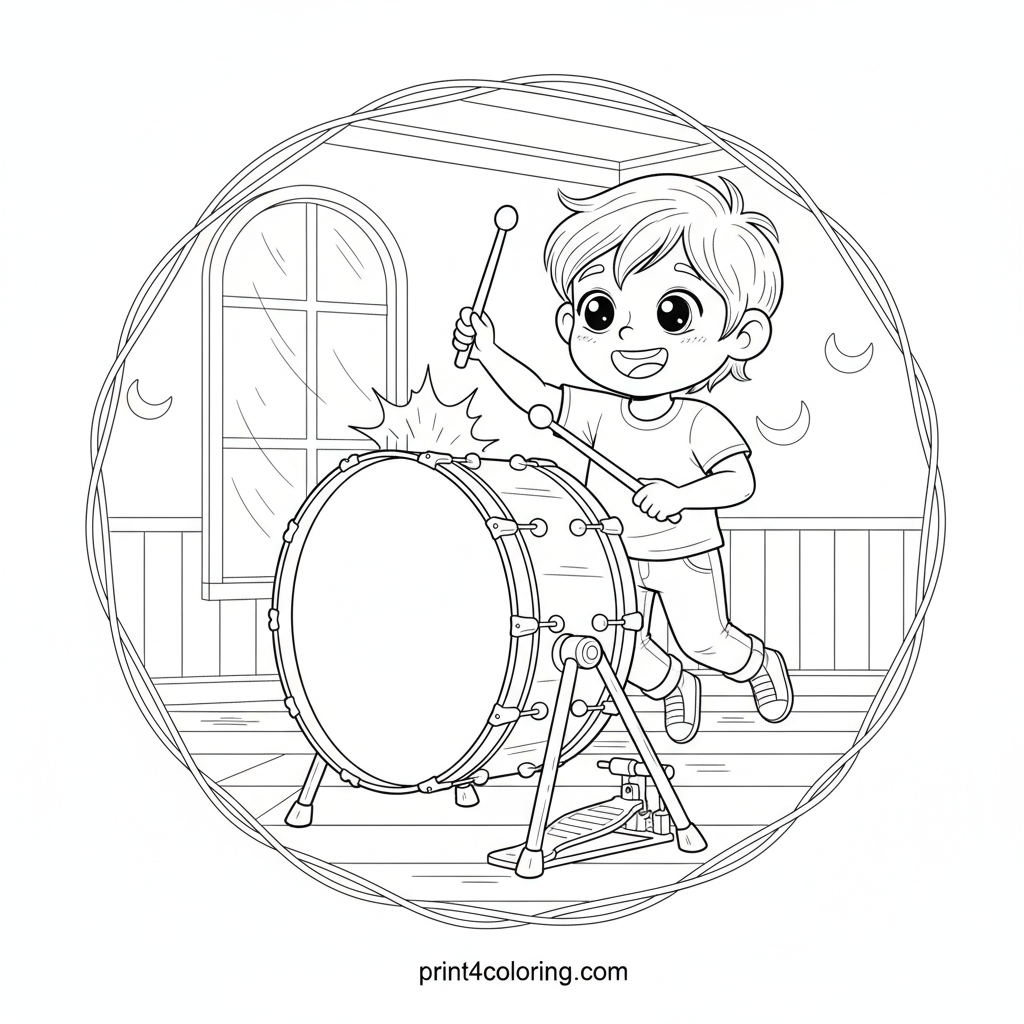 #music#drum#musician#child#joyful#instrument#rhythm#bass-drum#coloring-page#printable