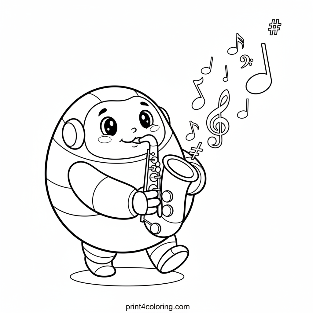 Join our adorable little robot as it marches with a big smile and even bigger musical talent! This cute, round friend plays a happy tune on its saxophone, leaving a trail of cheerful music notes. Grab your colors and bring this joyful musical parade to life, making every note pop!