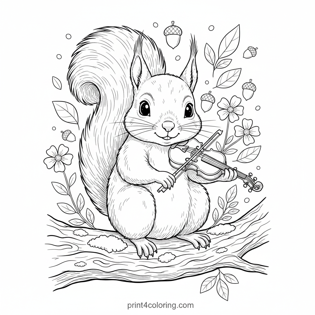 #squirrel#forest#music#violin#woodland#nature#animals#musical-instrument#acorns#wildflowers#detailed#coloring-page#printable