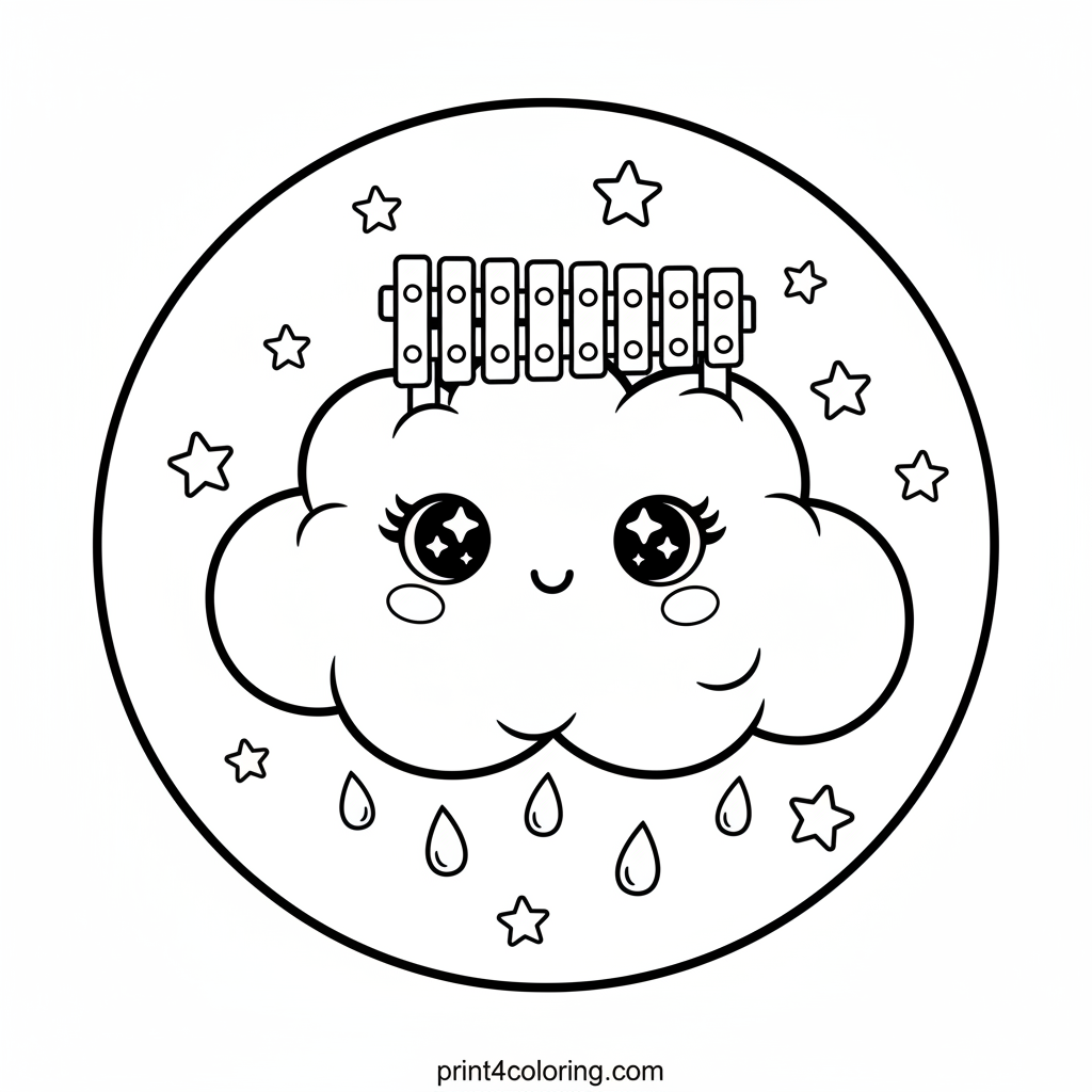 Float up to the sky with this adorable coloring page! A fluffy, smiling cloud hosts a magical concert, playing a beautiful rainbow xylophone. Watch as gentle stars and happy raindrops dance around, creating a cozy and enchanting scene perfect for your colorful imagination. Bring this whimsical sky concert to life!