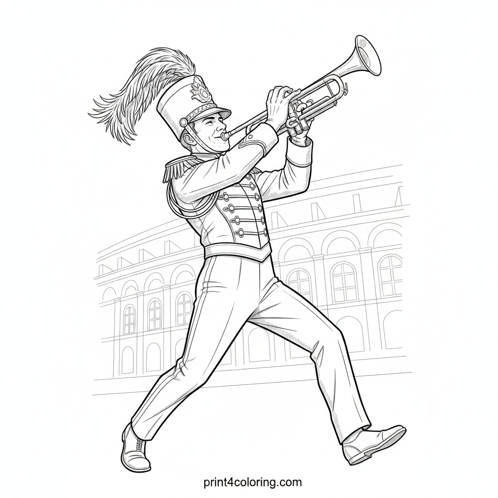 #marching band#trumpeter#parade#music#uniform#instrument#musician#stadium#city street#detailed#expert#coloring-page#printable