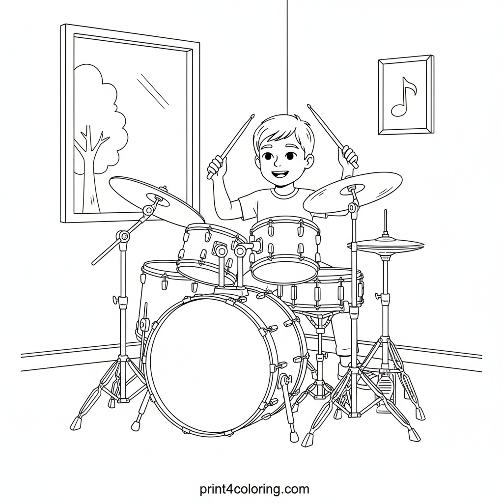 Mastering the Beat: The Young Drummer Coloring Page