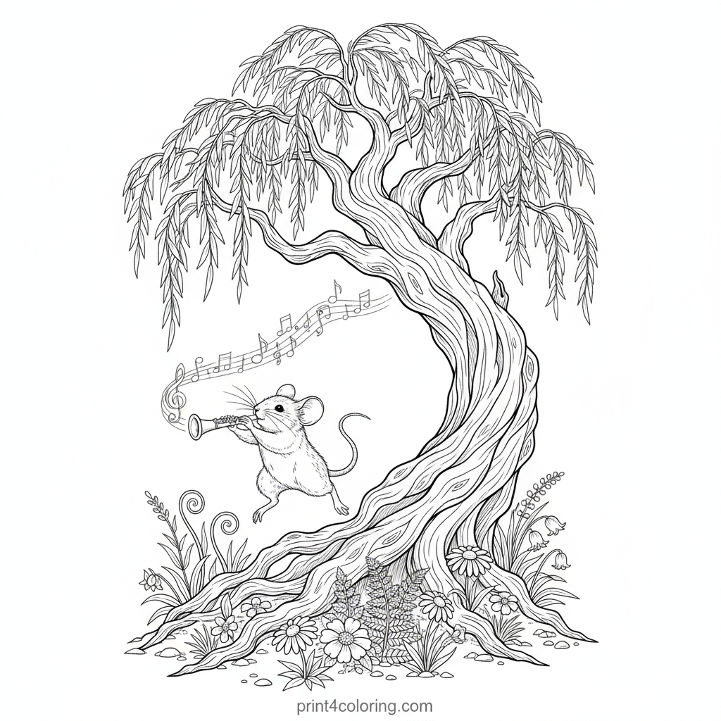 Melodies of the Whispering Willow: A Musical Mouse Adventure Coloring Page