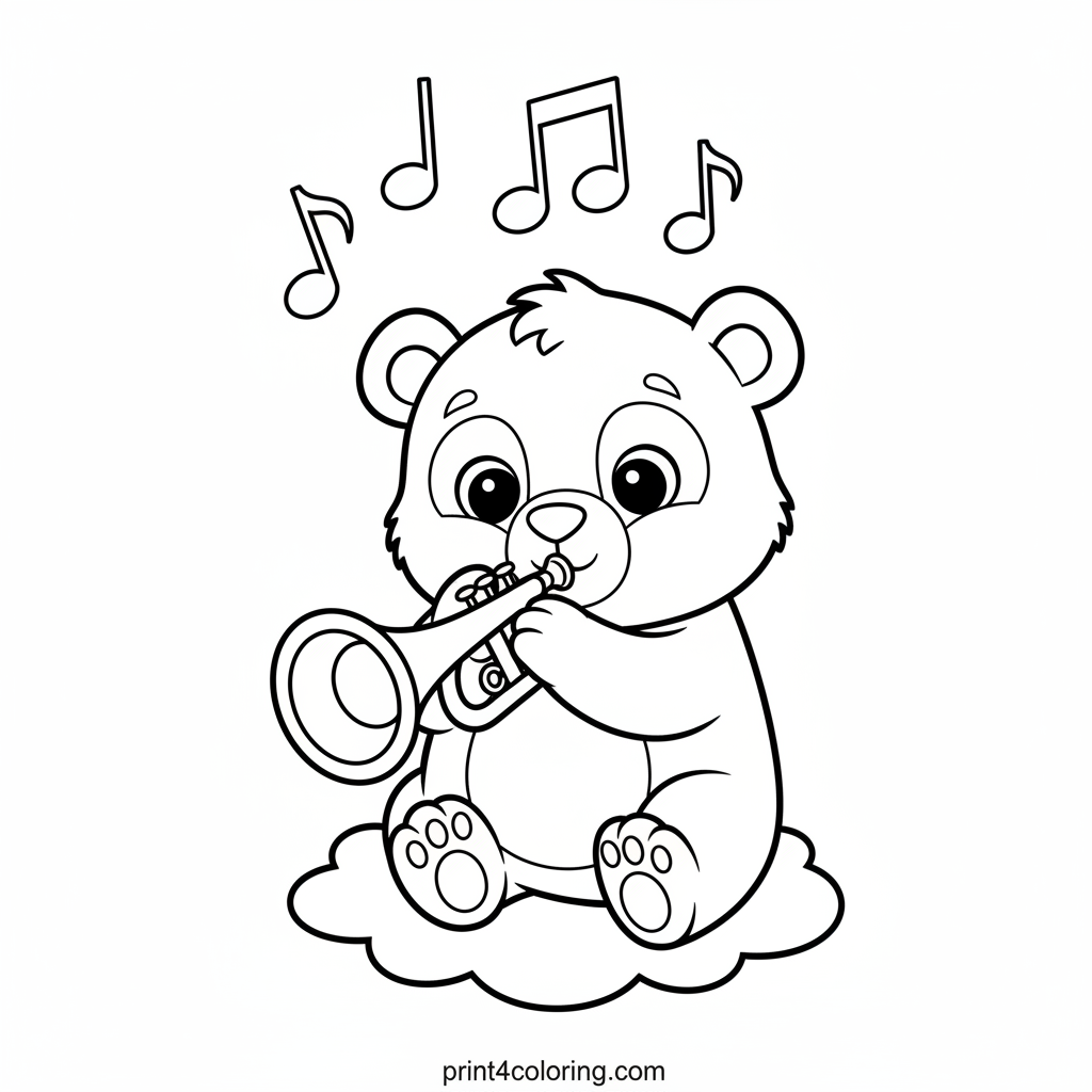 Join Melody Bear for her very first trumpet concert! This adorable bear cub, with big, happy eyes and a sweet smile, is perched on a soft cloud, playing a shiny trumpet. Cheerful musical notes float all around. Get ready to add vibrant colors to her joyful performance!