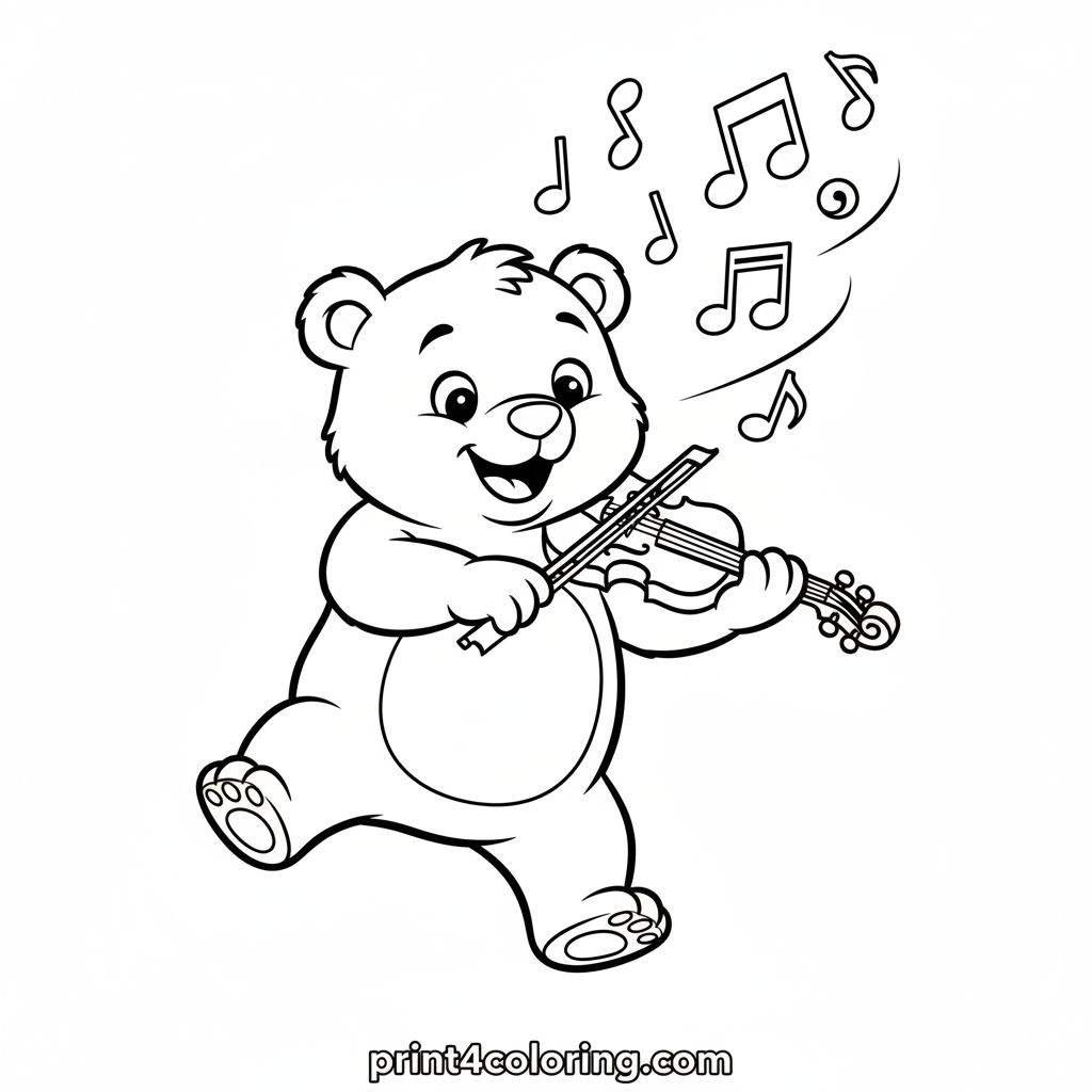 Meet Melody Bear, a chubby, smiling cub with big, friendly eyes! He's just starting his very first violin lesson, gently holding his small instrument and bow. Look at the happy music notes floating around him! This sweet scene is perfect for little artists to bring to life with their favorite colors.