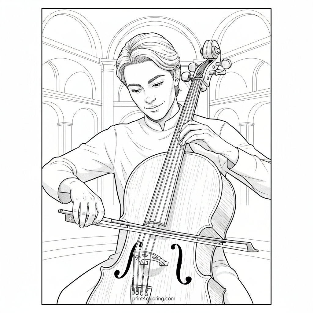 - 2🖍️ **Graceful Hands** - Carefully color the cellist's hands and fingers with realistic skin tones, using gentle shading to highlight their delicate posture on the strings.