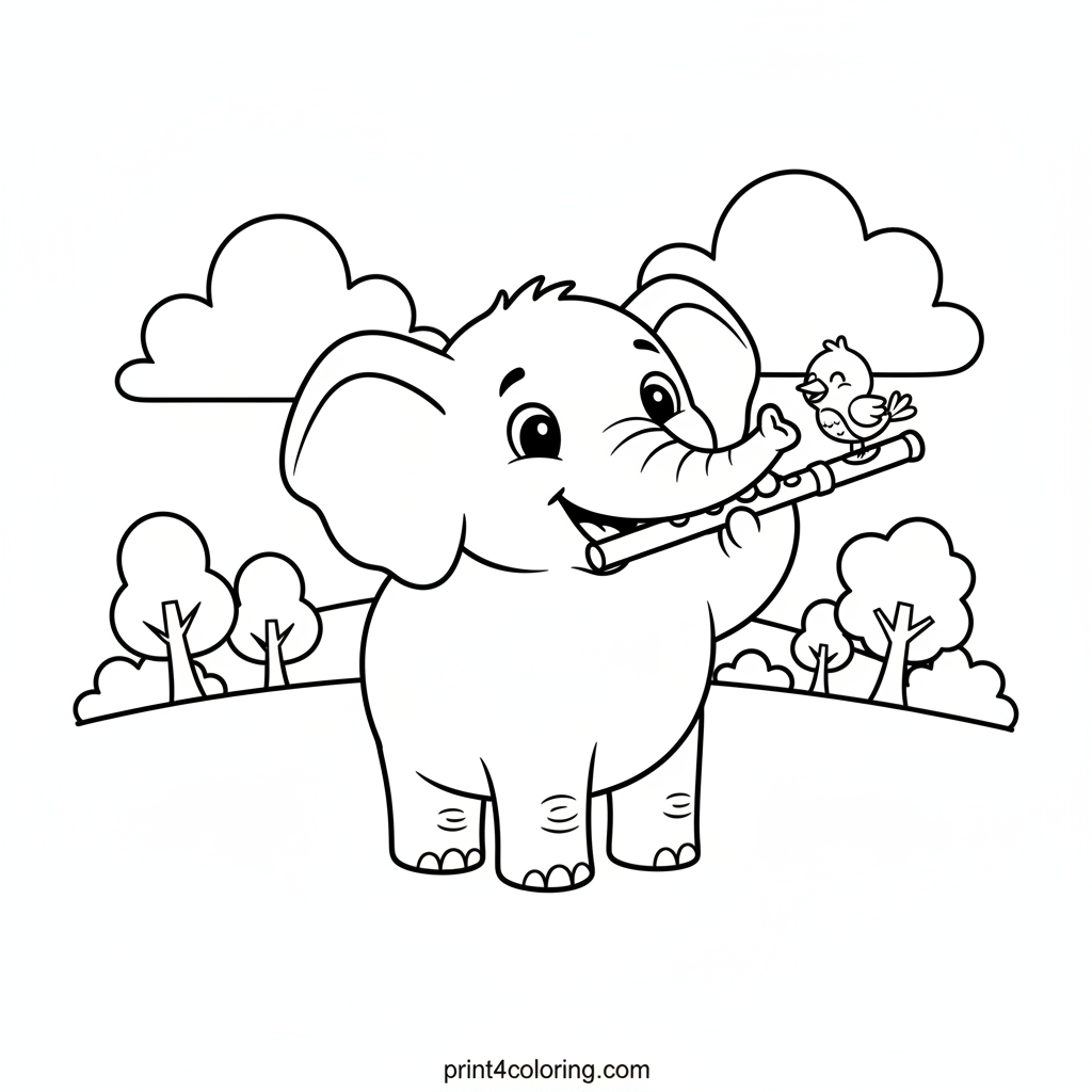 A cheerful, chunky elephant is ready to play a giant flute held carefully in its trunk. With eyes wide in happy concentration, this musical giant is joined by a tiny, friendly bird perched on the flute's end, looking utterly amused by the grand performance. Get ready to add vibrant colors to this delightful scene!