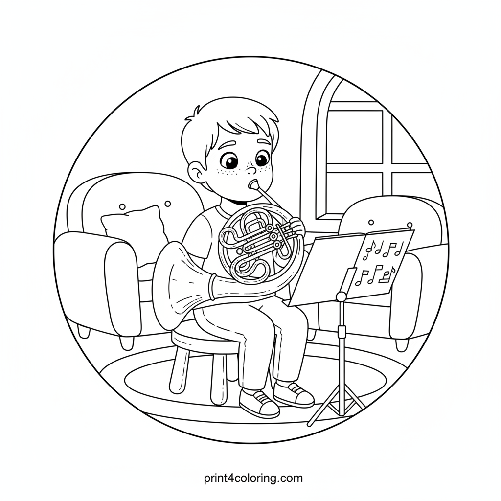 Join a sweet young musician as they embark on their musical journey, carefully holding a beautiful french horn. This cozy scene features a child's gentle concentration, a sturdy music stand, and detailed sheet music. Perfect for coloring intricate instrument details and a peaceful atmosphere.