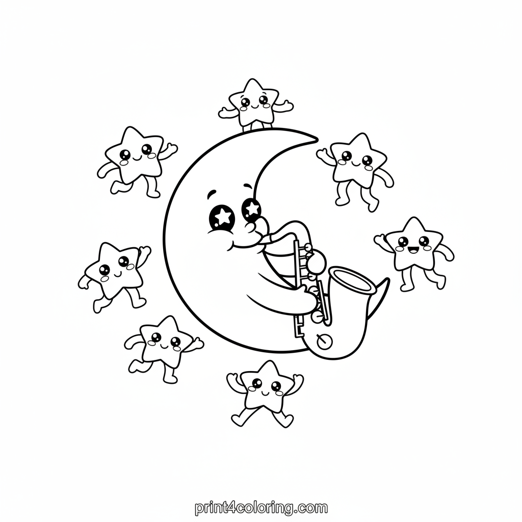 Get ready for a magical night! Color a friendly crescent moon as it plays a soothing saxophone tune. Watch tiny, happy stars twinkle and dance around, enjoying the beautiful music. This cozy scene is perfect for little artists to bring to life with their favorite colors.