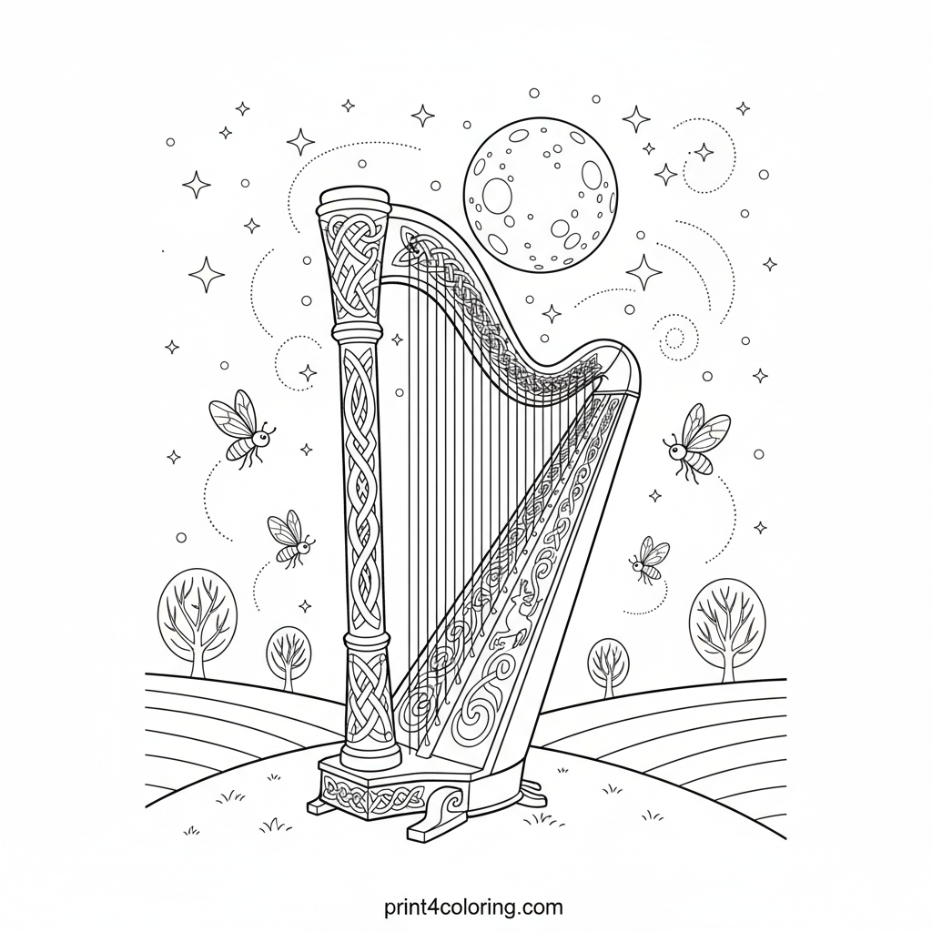 Imagine a majestic Celtic harp, intricately carved, standing on a gentle hillside. Above, a vast, starry night sky unfolds with a luminous moon casting a soft glow. Delicate fireflies shimmer and dance around the harp, drawn to its silent, magical melody under the celestial expanse. A challenging and rewarding scene awaits your colors.