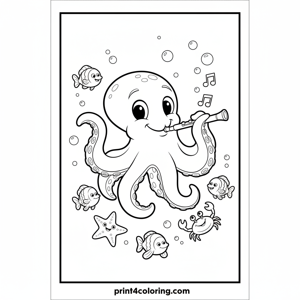 Dive into a magical underwater world! A friendly, smiling octopus with big, curious eyes plays a bubbly tune on its clarinet. Happy fish and sea creatures dance along, while gentle bubbles float upwards. Bring this joyful undersea concert to life with your favorite colors!