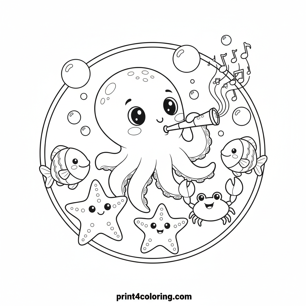 Dive into a whimsical underwater world! A friendly, smiling octopus plays a bubbly clarinet tune with one tentacle. Happy fish and other sea creatures dance along to the music, surrounded by gentle, floating bubbles. This cozy scene invites you to add vibrant colors to an enchanting ocean concert.