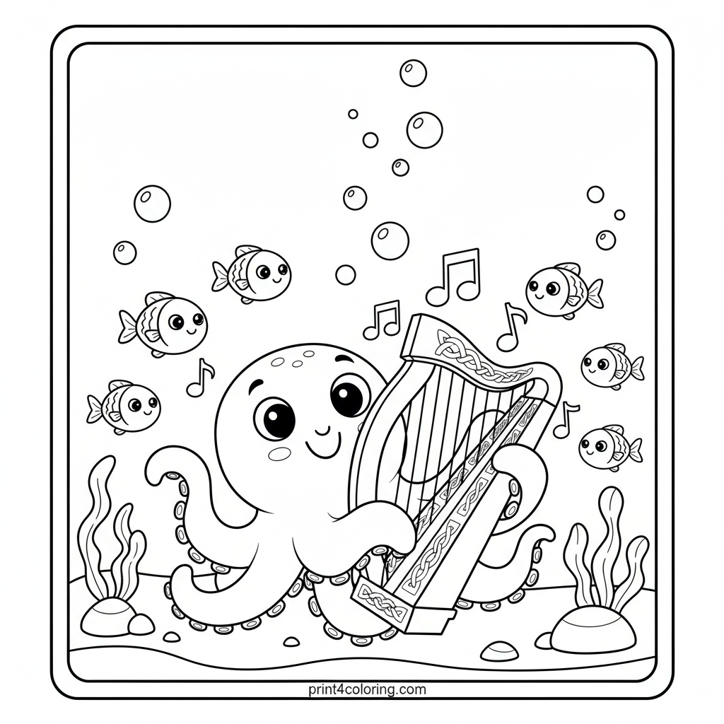 Discover a magical underwater concert! A friendly, bubbly octopus with a big smile gently plays a beautiful celtic harp, using all eight arms. Happy little fish swim around, enjoying the sweet melodies as soft bubbles float upwards. Get ready to color this enchanting ocean scene!