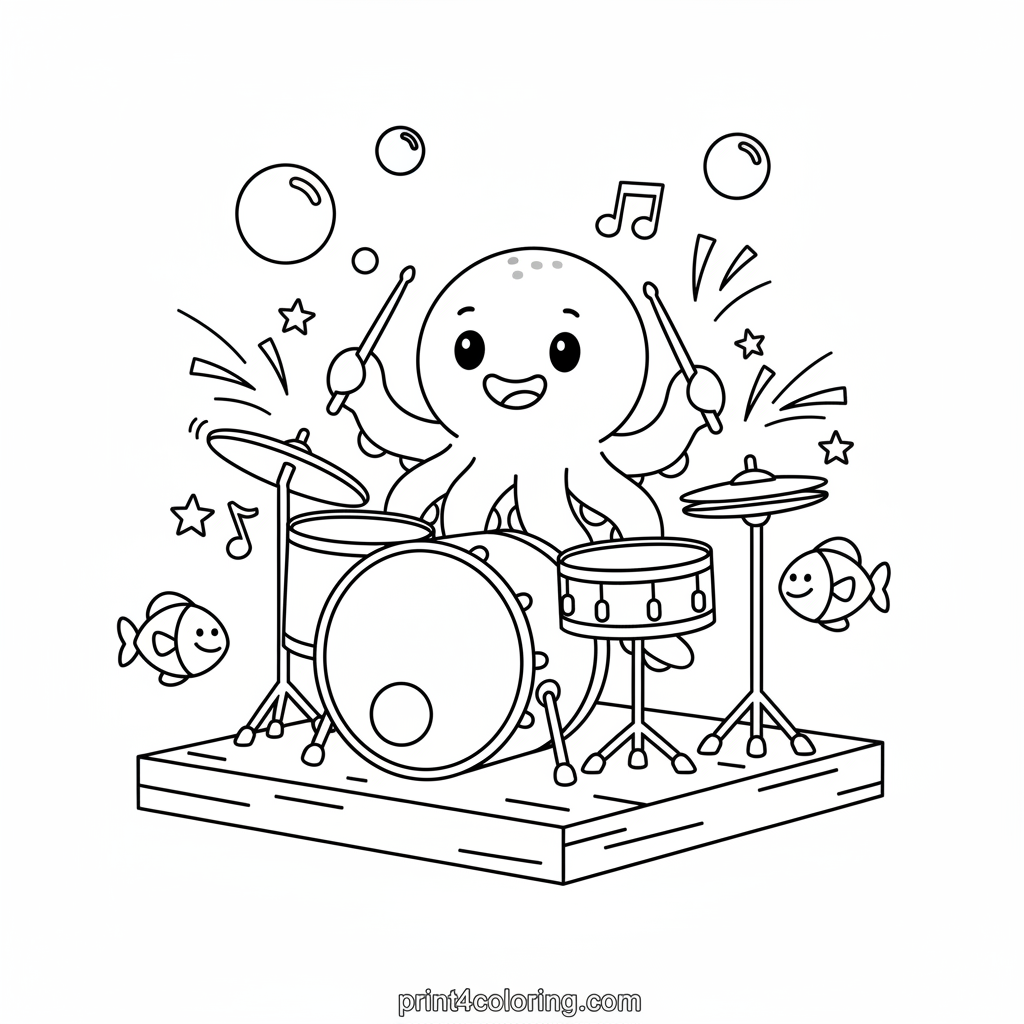 - 4🌈 Background Fun - Even though our octopus is underwater, you can imagine a cool stage or a colorful ocean background. Add some bubbles, seaweed, or even some fish cheering on the drummer!