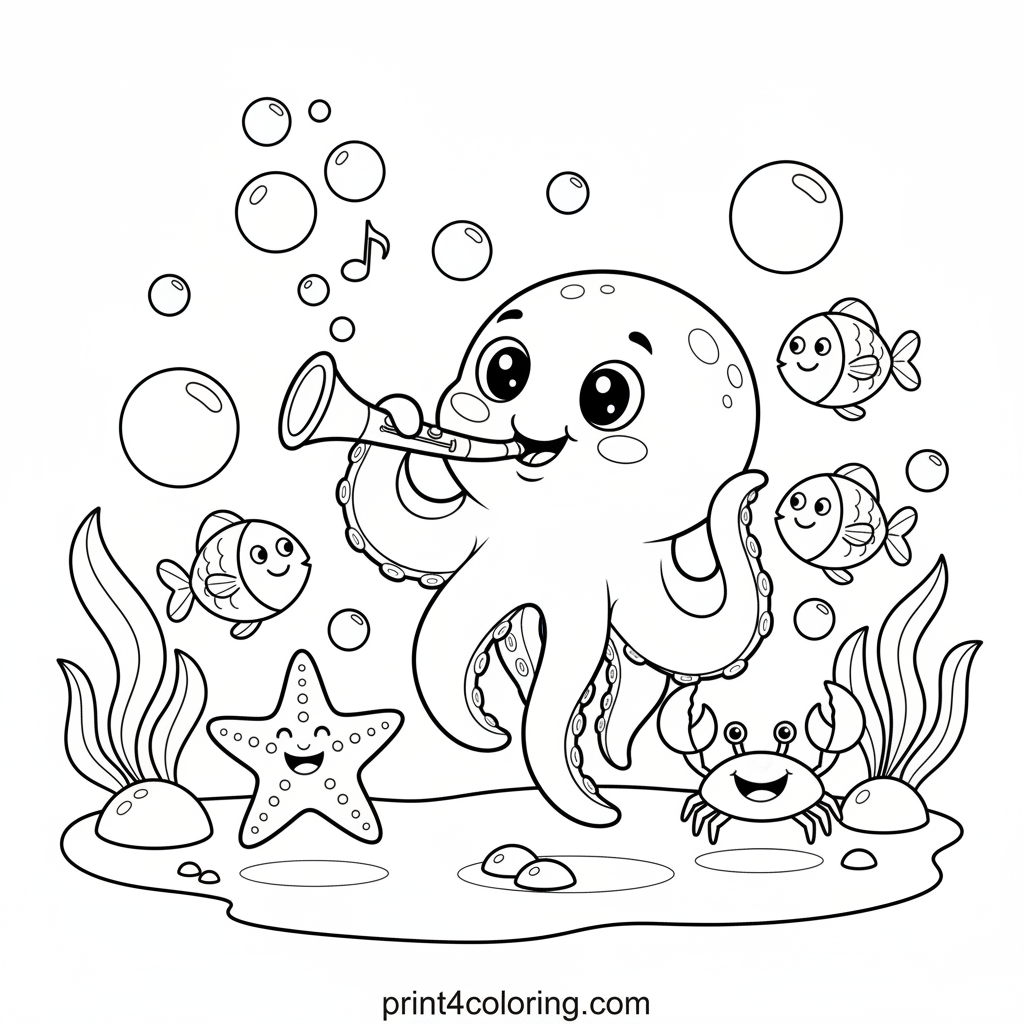Dive into a whimsical underwater world! A cheerful octopus with big, curious eyes plays a bubbly clarinet tune for its happy fish friends. Watch them dance and sway to the music as gentle bubbles float all around. Bring this magical ocean concert to life with your favorite colors!