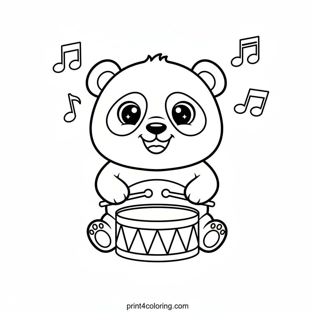 Meet our super cute, fluffy panda, ready for their first drum solo! With big, happy eyes and a cheerful smile, this adorable bear holds drumsticks, poised behind a simple drum kit. Floating musical notes surround them, inviting you to bring this joyful, rhythmic scene to life with your favorite colors.
