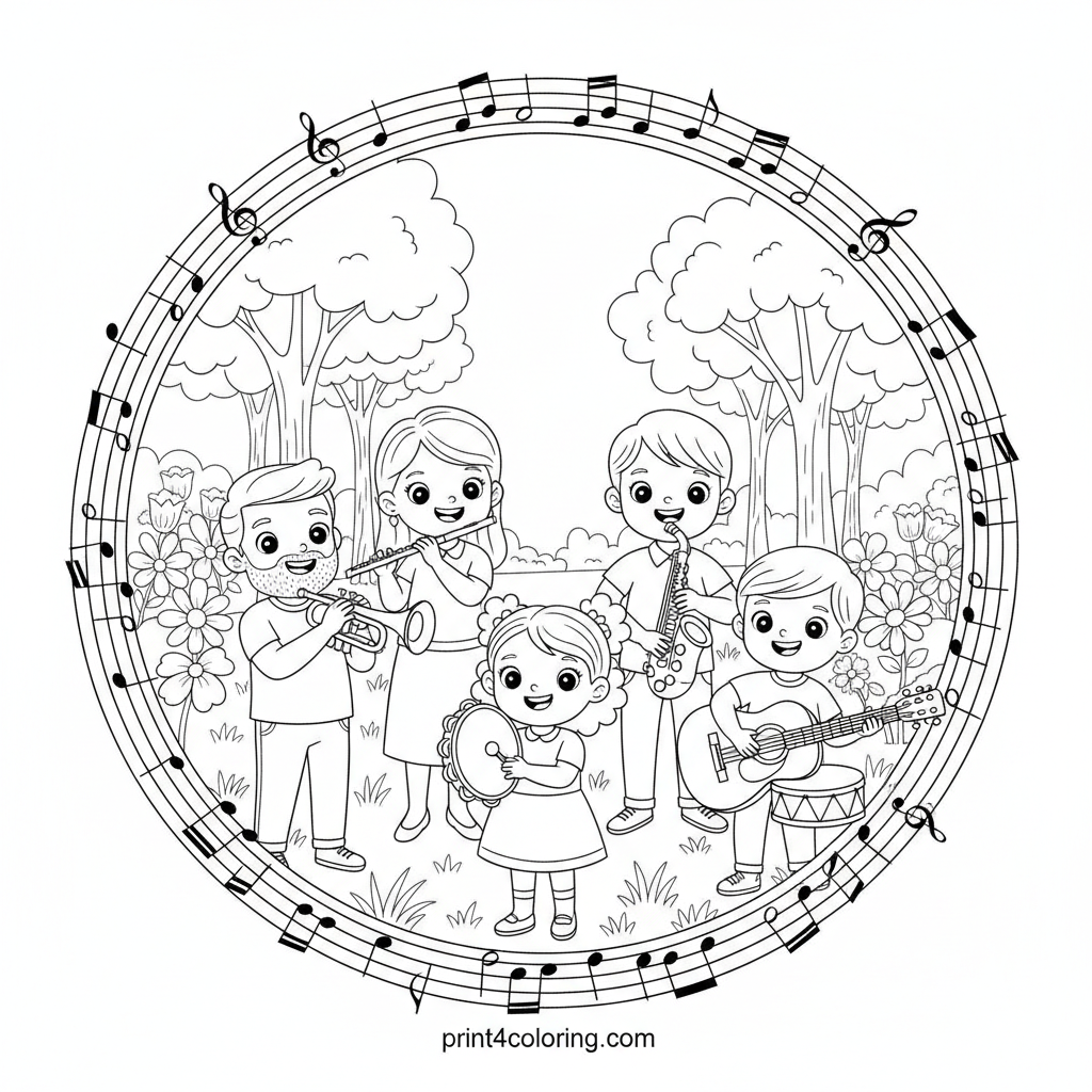 #park#band#music#instruments#children#adults#tambourine#nature#community#joyful#cozy#coloring-page#printable