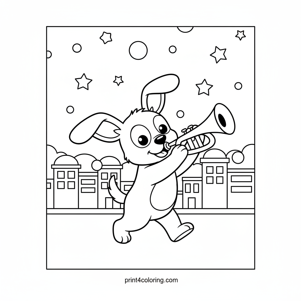 Get ready to march with this happy, energetic puppy! Our adorable pup has floppy ears and a wagging tail, proudly leading the parade. It's holding a shiny trumpet, ready to make joyful music, as colorful confetti gently floats all around. Bring this festive scene to life with your brightest colors!