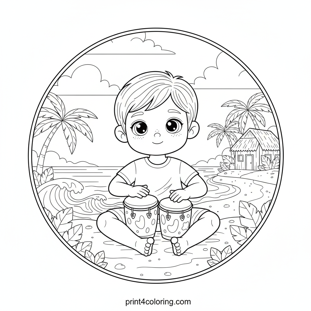 Immerse yourself in the serene beauty of an island paradise! A happy child practices gentle bongo rhythms on a sandy beach. Calm ocean waves, swaying palm trees, and a cozy thatched-roof hut complete this peaceful scene. Perfect for a relaxing coloring adventure.